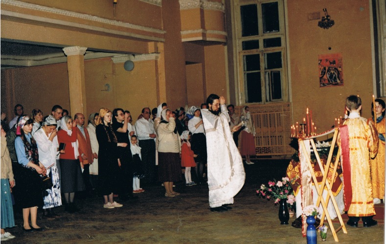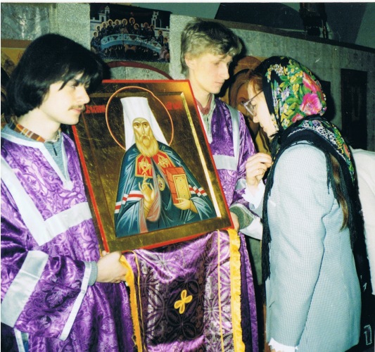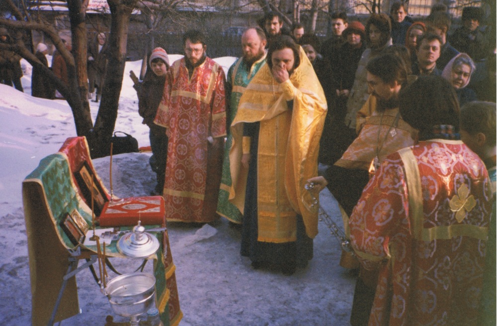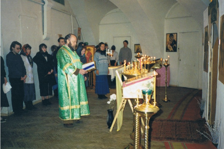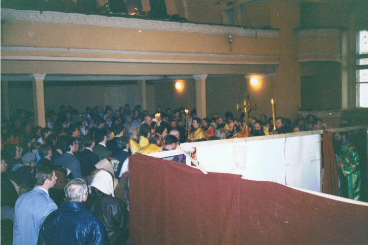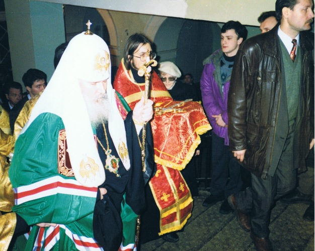 25 января 1991 года в храмовых стенах, но все еще в помещении Студенческого театра впервые после долгих десятилетий тотального атеизма отслужил молебен святой Татиане Святейший Патриарх Алексий.