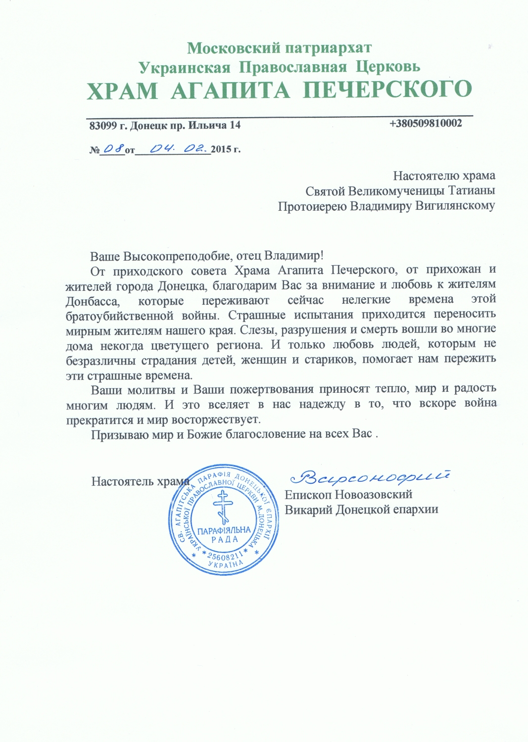 Письмо епископа Новоазовского Варсонофия настоятелю нашего храма протоиерею Владимиру Вигилянскому