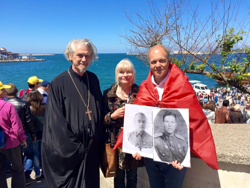Фото Григория Пруцкова (на снимке — крайний справа). Севастополь. 9 мая 2015 года. «С протоиереем Владимиром Вигилянским и матушкой Олесей Николаевой в Севастополе сразу после парада Победы»