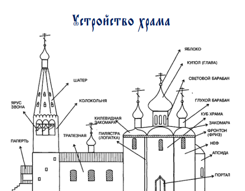 Представленная здесь схема здания православного храма отражает лишь самые общие принципы храмостроительства, на ней отражены лишь основные, присущие многим храмовым зданиям архитектурные детали, органично объединенные в единое целое.