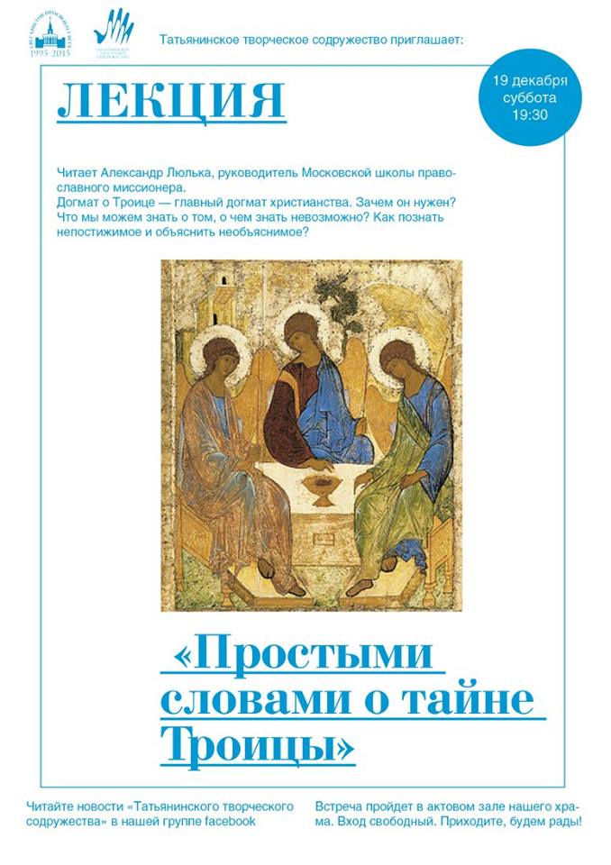 Татьянинское творческое содружество приглашает в субботу 19 декабря в 19.30 на лекцию Александра Люльки «Слово о Троице».