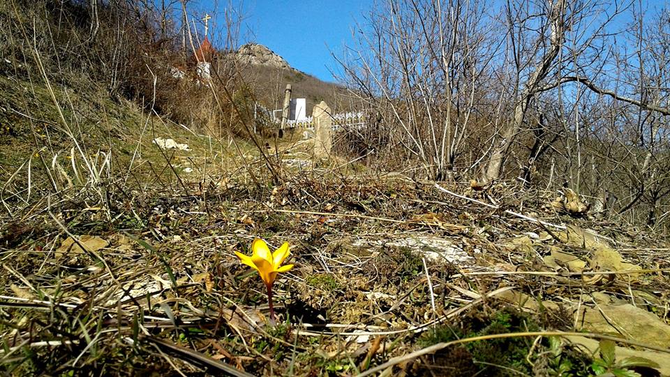 Дорога заканчивается в Краснокаменке – это деревня, похожая на чашу: со всех сторон её окружают скалы и лесистые склоны горы Кизилташ, и если задрать голову на восток, то сейчас, пока ещё деревья ещё не успели одеться в листву, можно разглядеть куполок маленького белого монастырского храма. Смотришь на него, как на маяк, и поднимаешься по лесной каменистой тропинке, а потом уже больше не знаешь, куда смотреть, потому что под ногами всё усеяно яркими оранжево-жёлтыми крокусами и какими-то нежными неведомыми голубыми цветочками, а вокруг вовсю летают пчёлки, рыжие бабочки и запахи трав и земли. Какая-то песнь об утверждении жизни в последний день зимы – это было со мной вчера, ещё в феврале, невероятно.