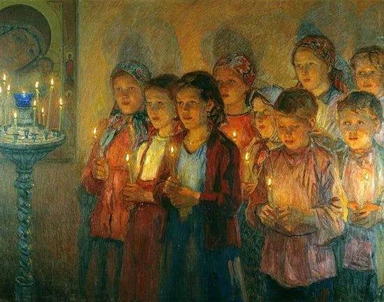 На репродукции картины Н.П. Богданова-Бельского (1868-1945) — обрядоверы. Пусть первый кто-нибудь кинет в них камень!