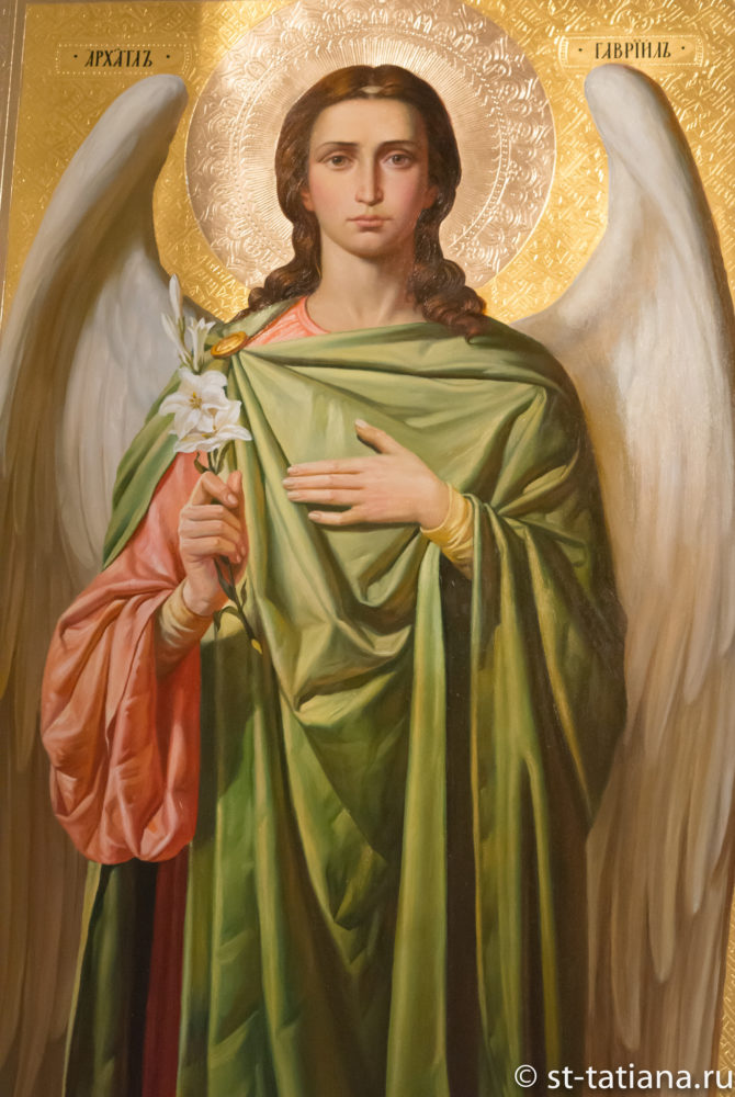 «Второе место в ряду Ангелов, после Архангела Михаила, принадлежит Гавриилу: имя, означающее силу Божию. Архангел сей в деле служения спасению человеческому является особенно провозвестником и служителем всемогущества Божия. Так — имеет ли открыться сила Божия в чудесном зачатии Предтечи от престарелых родителей, весть о сем зачатии возлагается на Гавриила. Имеет ли произойти бессеменное зачатие Самого Сына Божия, — честь благовестия о сем достается снова Гавриилу. Сей же Архангел, по мнению богомудрых мужей, послан был для подкрепления Спасителя в саду Гефсиманском и для возвещения Богоматери Ее всечестного Успения. Поэтому Церковь именует его служителем чуда. Но, служа чудесам, он по тому самому есть особенный служитель и таин Божиих. Святая Церковь изображает его иногда с райскою ветвию в руке, которая принесена им была Богоматери, а иногда в правой руке с фонарем, внутри которого горит свеща, а в левой — с зерцалом из ясписа.