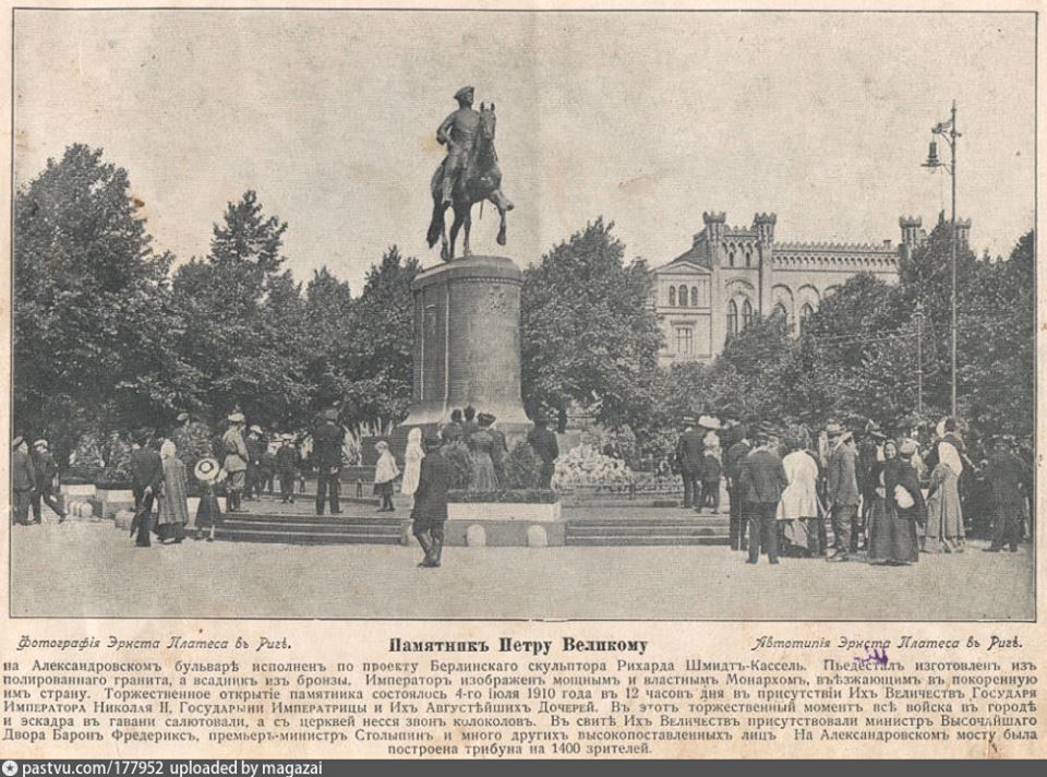 4 июля 1910 года в день 200-летия вхождения русских войск в Ригу в присутствии августейшей семьи Императора Николая II конная статуя Петра Великого была освящена.