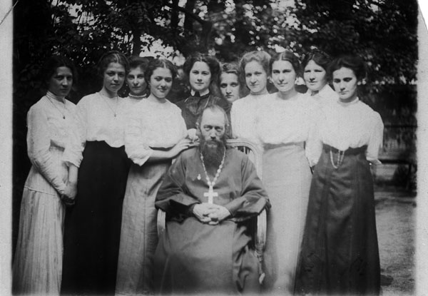 Отец Иосиф Фудель и ученицы гимназии С.Н.Фишер.  Фотография. Москва, 1910-е гг. Фото: «Русский путь»