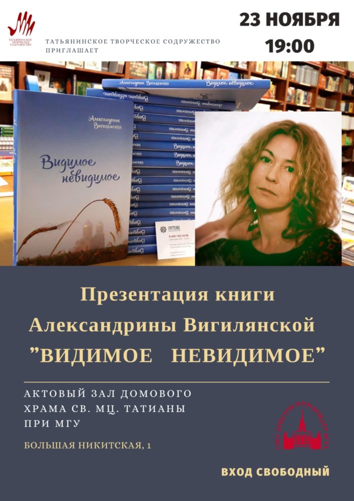Татьянинское творческое содружество приглашает 23 ноября (пятница) 2018 года в 19.00 на презентацию книги Александрины Вигилянской «Видимое невидимое», которая состоится в Актовом зале Домового храма мученицы Татианы при МГУ.