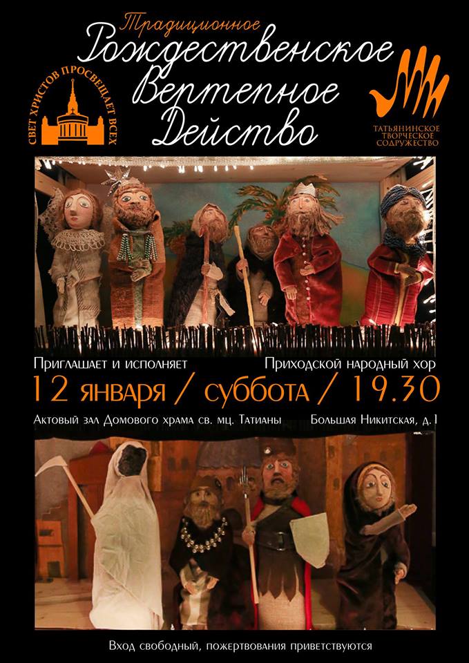 12 января (суббота) в 19.30 в Актовом зале Домового храма мученицы Татианы при МГУ церковно-приходской хор под управлением Марины Конотоповой представит традиционный Рождественский вертеп, организованный при участии Татьянинского творческого содружества.