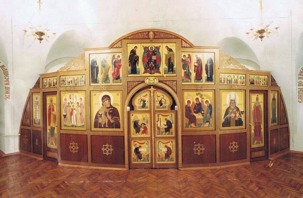«Иконостас из храма преподобного Серафима Саровского, созданный в 1951 году стараниями общины и мастерами во главе с Анатолием Нератовым, перенесен в Москву в 1991 году и передан храму св. мц. Татианы в 1998 году приснопамятным протопресвитером Александром Киселёвым (1909-2001)».