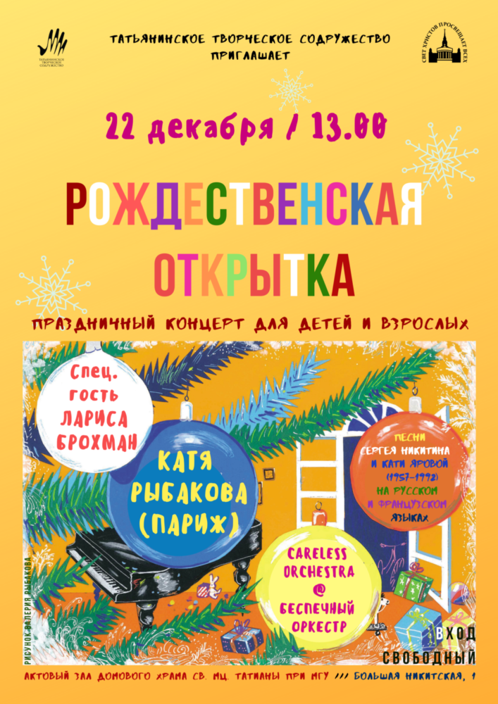 Татьянинское творческое содружество приглашает 22 декабря (воскресенье) в 13.00 на праздничный концерт «Рождественская открытка».