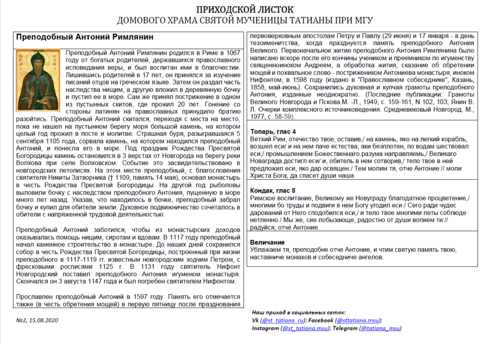 С августа 2020 года Домовый храм святой мученицы Татианы начал выпуск приходского листка.
