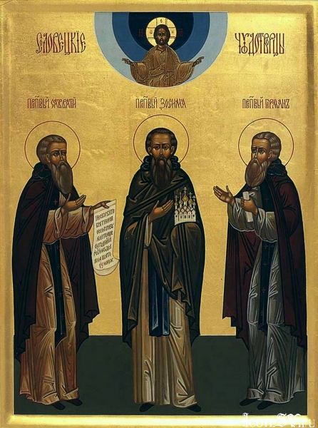 О преподобнии отцы, велицыи заступницы и скории услишателие молитв, угодницы Божии и чудотворцы Зосимо, Савватие и Германе! Не забудите, якоже обещастеся, посещати чада ваша. Аще бо и отыдосте от нас телом, но духом присно с нами пребываете. Молим убо вы, о преподобнии: избавите ны от огня и меча, от нашествия иноплеменников и междоусобныя брани, от тлетворных ветров, и от напрасныя смерти, и от всех прилогов бесовских, находящих на ны. Услышите нас, грешных, и приимите молитву сию и моление наше, яко кадило благовонное, яко жертву благоугодну, и души наша, злыми делы, и советы, и помыслы умерщвленныя, оживите и, якоже умершую отроковицу востависте, якоже неисцельны раны многих исцелисте, от духов нечистых зле мучимых избависте, тако и нас, содержимых во узах вражиих, измите и от сетей диавола избавите, из глубины прегрешений изведите и милостивым вашим посещением и ходатайством от врагов видимых и невидимых оградите ны благодатию и силою Всесвятыя Троицы, всегда, ныне и присно и во веки веков. Аминь.