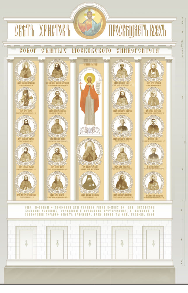 Всего в иконе 22 образа университетских святых начиная со святителя Филарета Московского (Дроздова), который освящал храм во имя мученицы Татианы; есть там святые – мученики и исповедники, погибшие или умершие в ссылках и тюрьмах в лихолетье с 1917 по конец 1930-х годов. В центре 23-й образ – мученица Татиана, покровительница университета.