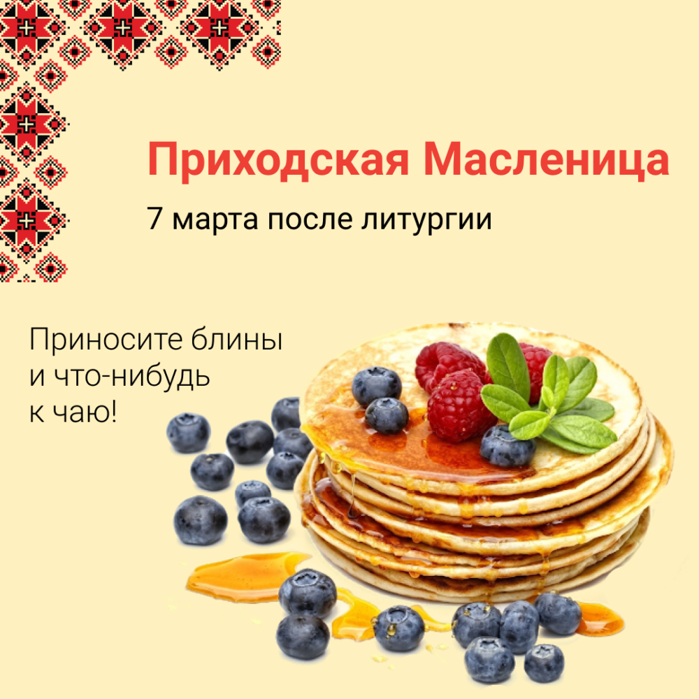 7 марта 2021 года (воскресенье) после литургии прихожане нашего храма приглашаются на празднование Масленицы.