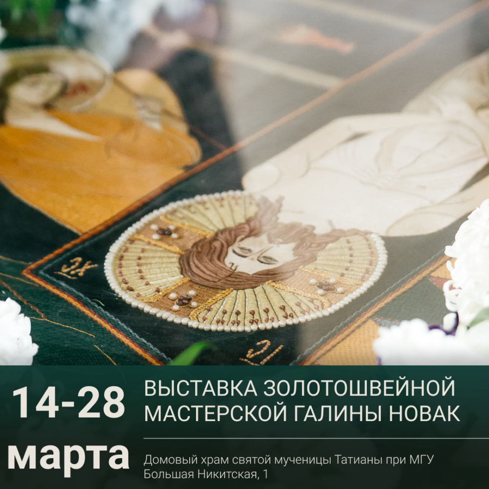 13 марта 2021 года (суббота) в 16.00 в Актовом зале Домового храма святой мученицы Татианы при МГУ откроется выставка золотошвейной мастерской Галины Новак.