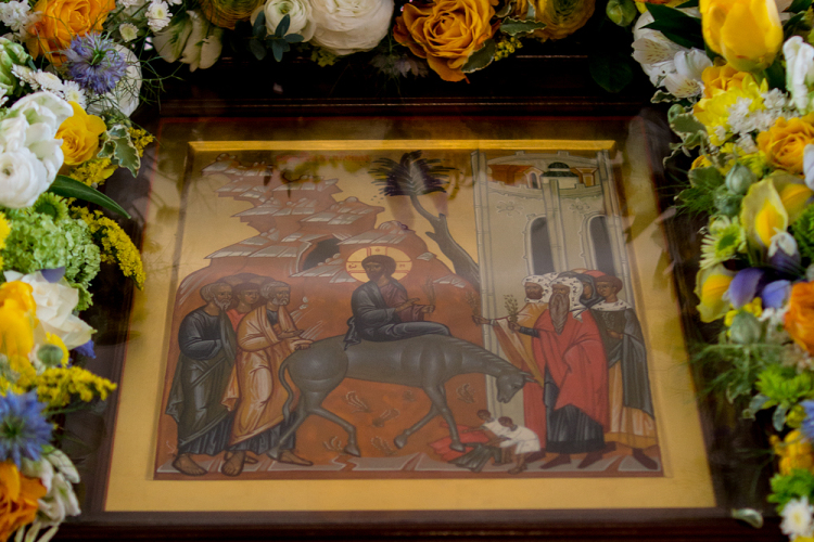 Сотворив накануне чудо воскресения Лазар, Христос совершает торжественное вхождение в Иерусалим. Новость о происшедшем чуде воскрешения человека, пробывшего в гробнице уже четыре дня, мгновенно разнеслась по иерусалимским пределам, и народ восторженно встречал Христа, громко восклицая: «Осанна (Спасение) Сыну Давидову! Благословен Грядущий (Приходящий) во имя Господне!»